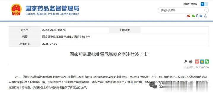 2025年7月30日,国内迎来第七款CAR-T产品——恒润达生申报的雷尼基奥仑赛注射液(商品名:恒凯莱,HR001)获批上市,用于治疗经过二线或以上系统性治疗后成人复发或难治性大B细胞淋巴瘤,包括弥漫性大B细胞淋巴瘤非特指型、滤泡性淋巴瘤转化的弥漫性大B细胞淋巴瘤、伴MYC和BCL2重排的高级别B细胞淋巴瘤、高级别B细胞淋巴瘤非特指型。